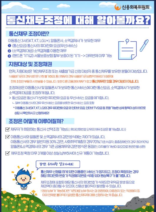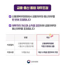 금융 통신 통합채무조정은 2025년 새롭게 개선된 제도로, 채무 조정과 더불어 통신서비스 이용까지 함께 해결할 수 있는 획기적인 방안입니다. 특히 통신채무와 금융채무를 함께 가지고 계신 분들에게 큰 도움이 될 것입니다.